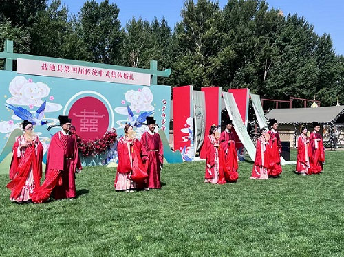 “七夕”當天,寧夏鹽池縣在鹽池縣哈巴湖生態景區舉辦第四屆“百雀筑橋只為你 七夕與君伴終身”傳統中式集體婚禮。 七夕今宵看碧霄,牽??椗珊訕??;顒釉谟茡P的古箏琴聲啟幕,10對新人身著傳統婚服,在現場嘉賓和眾多親友的共同見證下,踏上紅地毯,邁進幸福門,在中式婚禮特有的浪漫氛圍中喜…