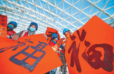 春節臨近,北京建工為堅守重大工程項目一線的務工人員發放春節禮包。此外,項目部還推出了提高食堂伙食標準、組織工地春晚等一系列措施,讓大家感受到就地過年的溫馨。圖為北京建工國家會議中心二期項目工地的工人收到春聯、福字等新春禮物。