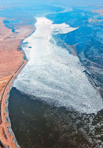 隆冬季節,黃河干流上、中、下游河段均出現流凌,其中內蒙古河段封凍超過500公里,呈現千里冰封景象。新華社記者 劉詩平攝