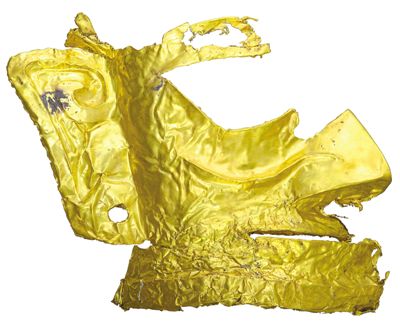 圖為三星堆遺址發掘現場出土的金面具殘片。