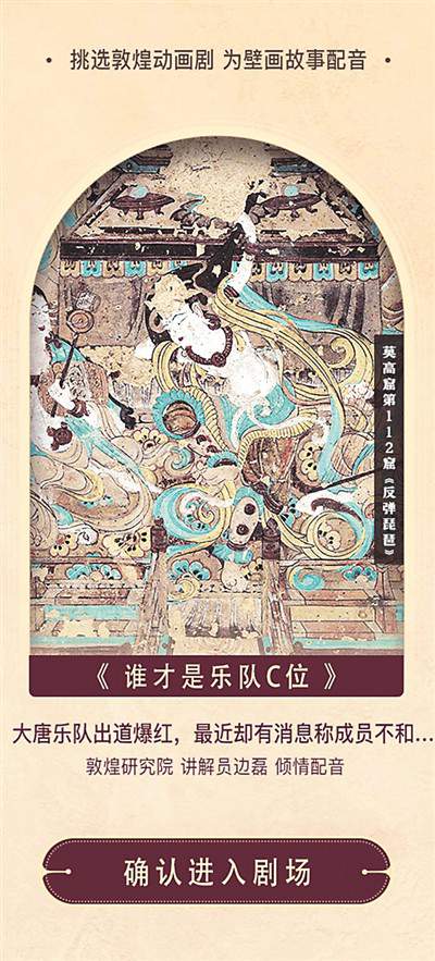 琵琶、阮咸、箜篌、橫笛、拍板、檐鼓,誰才是大唐樂隊的C位?打開微信小程序“云游敦煌”,一部時長不到3分鐘的動畫劇《誰才是樂隊C位》(如圖),不僅以幽默而接地氣的故事,將敦煌壁畫中的樂器知識娓娓道來,還極具創意地增加了配音功能,用戶只要輕擊手機屏幕,就可以選擇劇里的一個或多個角色進行配音。