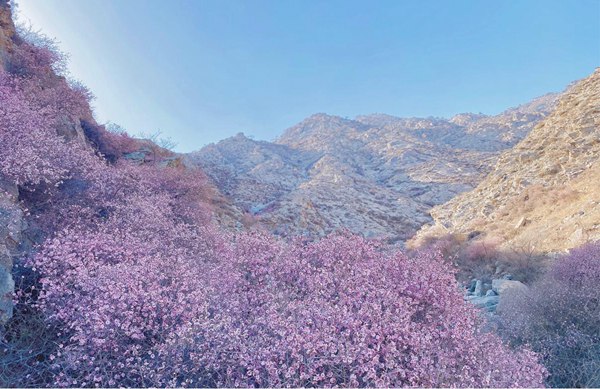 賀蘭山上的桃花梨花有的迎風初綻,一邊爬山,一邊欣賞桃花梨花,別有一番風味。