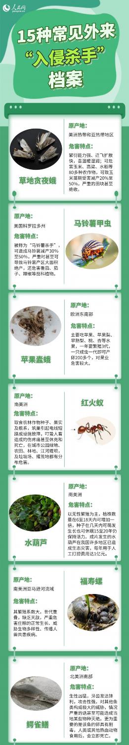 草地貪夜蛾、馬鈴薯甲蟲、紅火蟻、水葫蘆、福壽螺、鱷雀鱔、豚草……今年年初,農業農村部等多部門聯合發布的《進一步加強外來物種入侵防控工作方案》中專門點名了15個外來入侵物種,一起來看看這些“入侵殺手”的真面目: