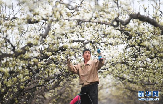 4月5日,河北省雄安新區雄縣雄州鎮馬蹄灣村果農在梨園為梨樹剪枝。
