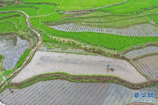 4月5日,村民在浙江省麗水市景寧畬族自治縣大漈鄉梯田里翻耕,以備種植茭苗(無人機照片)。