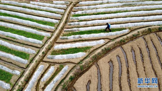 4月5日,在福建省龍巖市永定區培豐鎮,農民在田間勞作(無人機照片)。