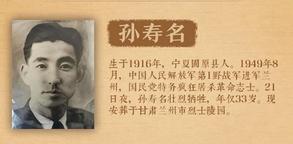 1949年8月,中國人民解放軍第一野戰軍進軍蘭州,國民黨特務瘋狂屠殺革命志士。21日夜,孫壽名同志壯烈犧牲,年僅三十二歲,F安葬于蘭州市烈士陵園。