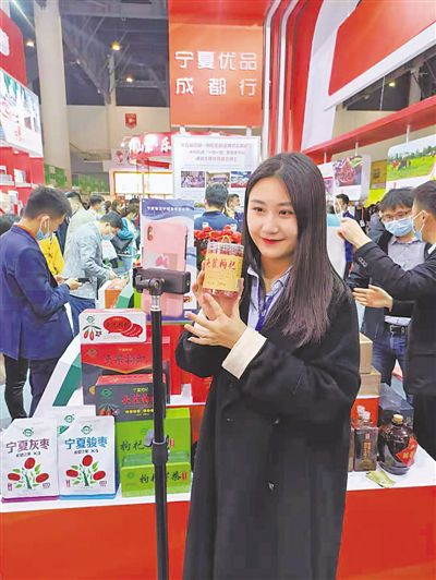 當天,全國糖酒商品交易會有42個國家和地區的4106家參展商參展。記者在寧夏企業展臺看到,現場烹飪的寧夏灘羊肉、沖泡好的八寶茶、特色枸杞制品吸引眾多參觀者駐足。寧夏沃福百瑞枸杞產業股份有限公司更是在展會上發布新產品“枸杞水”,讓不少采購商頻頻回頭。線上直播間也是熱鬧非凡。來自寧夏和成都兩地的網紅主播正向全國各地的網友們展示本次參展的各種商品,現場的企業也輪流在直播間推薦特色產品!拔覜]去過寧夏,但在《山海情》里看到過寧夏的羊肉。今天品嘗了一下,果真美味!眮碜哉憬膹埩④娬f,今年一定去寧夏走走看看。