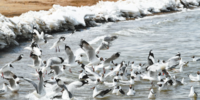 6日,青海湖開湖后,迎來棕頭鷗戲水的美景。
