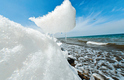 6日,青海湖岸邊堆積的各種形態的冰壩。