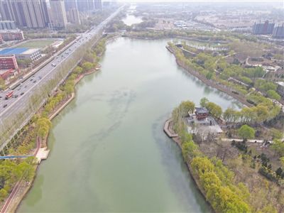 4月10日,隨著典農河水位上漲,風簾翠幕樹繞堤的景象在典農河畔隨處可見。圖為典農河金鳳區長城路至黃河路段。記者 裴云云 攝