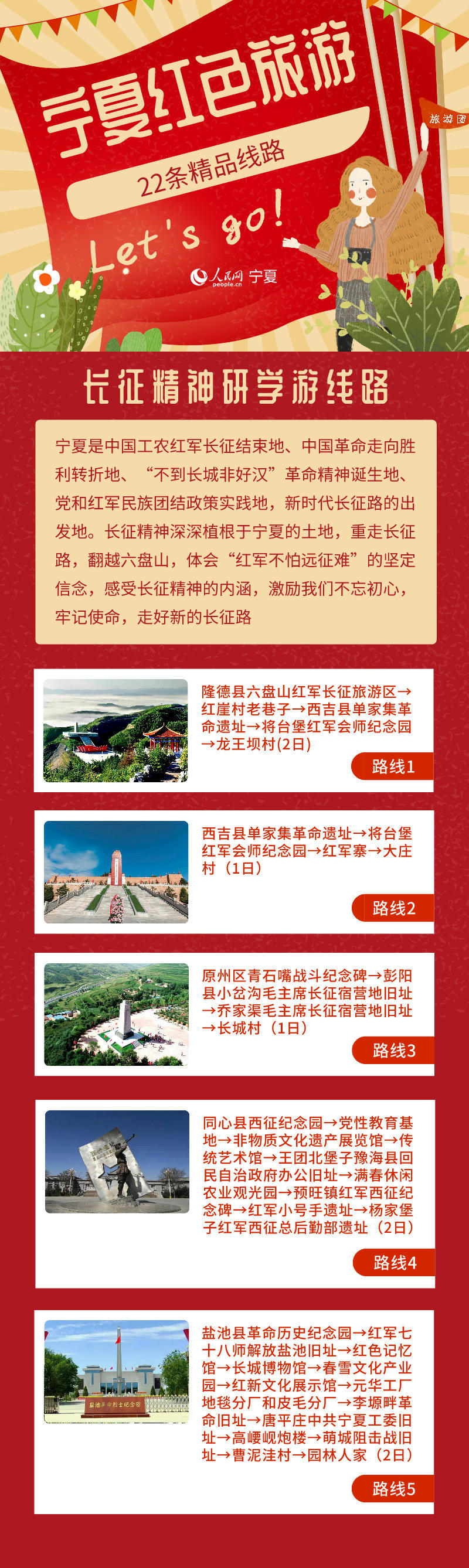 近日,寧夏重點圍繞“重溫紅色歷史、傳承奮斗精神”“走近大國重器、感受中國力量”“體驗美麗鄉村、助力鄉村振興”等主題,遴選推出“慶祝建黨100周年寧夏22條紅色旅游精品線路”,其中,長征精神研學游線路5條、紅色記憶研學游線路7條、感受中國力量研學游線路3條、美麗鄉村研學游線路7條,結合全黨開展的黨史學習教育,為各地各部門開展紅色研學和主題黨日活動提供支撐。