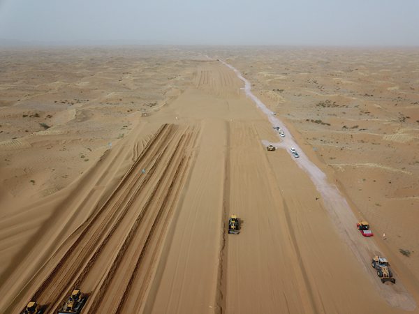 建設烏瑪高速,有一個最大的難點,就是需要穿越騰格里沙漠腹地18公里。騰格里沙漠地形起伏,流動沙丘眾多,屬中溫帶典型的大陸性氣候,降水稀少,終年為西風環流控制,風勢強烈,年均風速4.1米/秒,最大風力達11級,在這樣的環境下施工,難度很大。