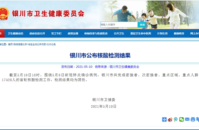 人民網銀川5月10日電 (寬容)據銀川市衛健委消息,截至5月10日18時,圍繞5月8日新冠肺炎確診病例,銀川市共完成密接者、次密接者、重點區域、重點人群17428人的首輪核酸檢測工作,檢測結果均為陰性。