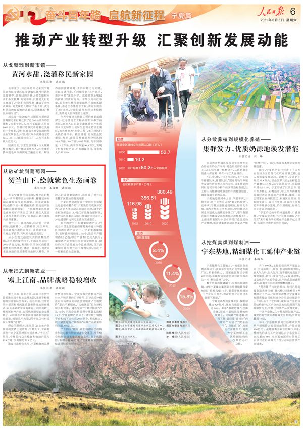 車至寧夏賀蘭山東麓,漫步在曠野上,一串串葡萄正由綠轉紫,藤蔓延伸向藏在葡萄園深處的酒堡。往來游客如織,山腳下品一杯精釀美酒,臨走還可自助購買郵寄到家……“很難想象這里曾是廢棄的礦產采空區,我們酒莊人見證了這方土地的巨變!敝据x源石酒莊董事長袁輝感慨。