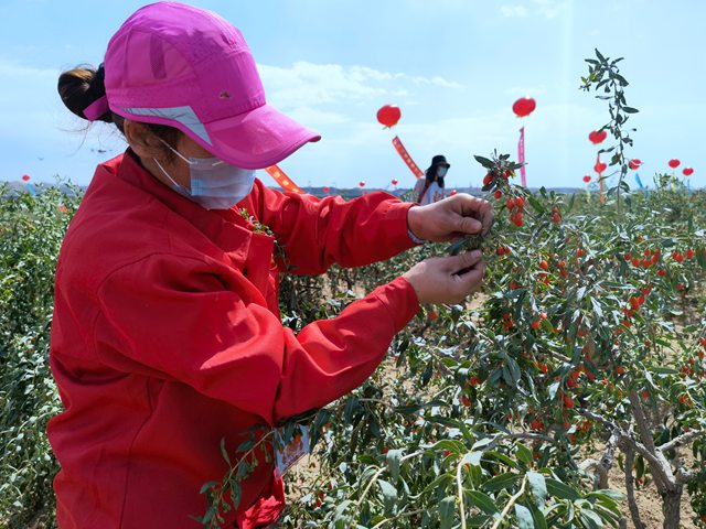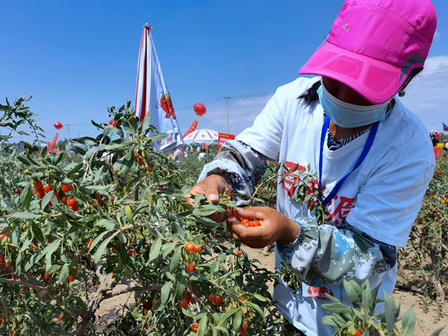 人民網銀川6月24日電 (記者 劉峰)摘一顆枸杞,放到嘴里嚼一嚼,皮薄汁甜,沁人心脾。6月23日下午,寧夏第四屆枸杞產業博覽會枸杞采摘節在寧夏中寧縣紅梧山枸杞標準化種植基地火熱開賽。