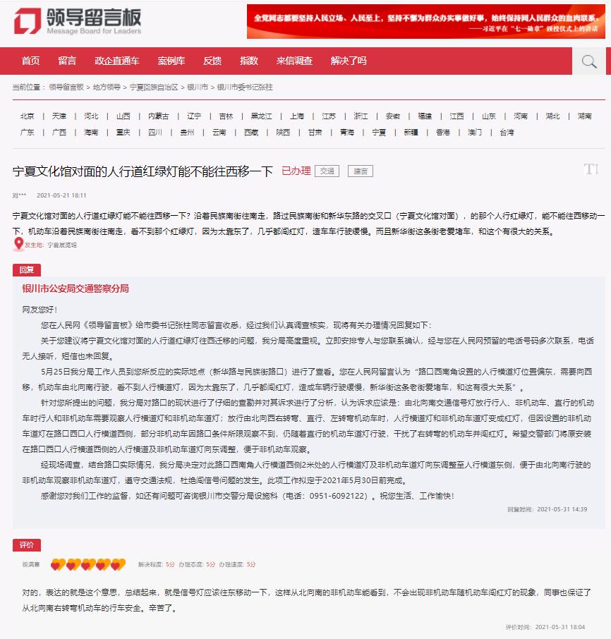 得到官方回復后,該網友表示非常滿意,“這樣,從北向南的非機動車能看到,不會出現非機動車隨機動車闖紅燈的現象,同時也保證了從北向南右轉彎機動車的行車安全。辛苦了!