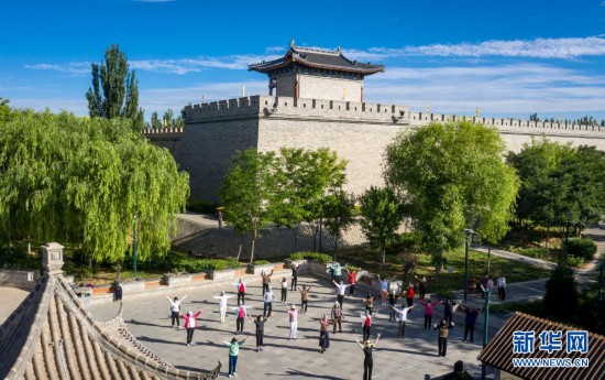 6月18日,寧夏鹽池縣居民在城墻腳下跳廣場舞(無人機照片)。