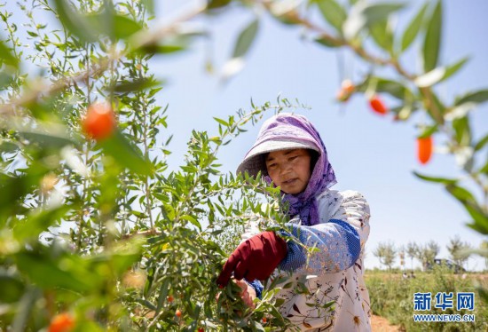 7月1日,采摘工在寧夏中寧縣璽贊生態枸杞莊園采摘枸杞。