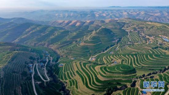 這是7月14日在寧夏固原市彭陽縣拍攝的青云灣旱作梯田公園(無人機照片)。