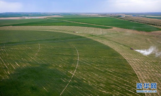 在寧夏鹽池縣馮記溝鄉平臺村的優質牧草基地,農戶用機械收割牧草(無人機照片,7月14日攝)。新華社記者 楊植森 攝
