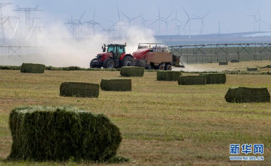 在寧夏鹽池縣馮記溝鄉平臺村的優質牧草基地,農戶用機械將牧草打捆(7月14日攝)。