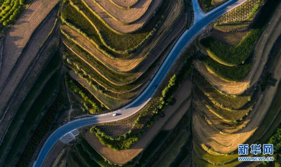 這是7月13日在寧夏固原市彭陽縣拍攝的青云灣旱作梯田公園(無人機照片)。