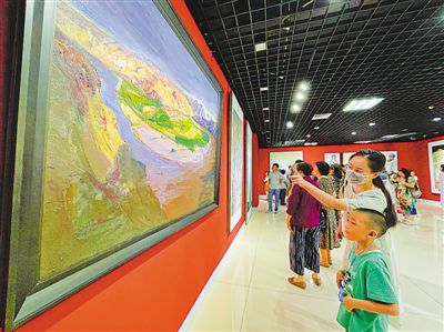 7月21日,一位母親正在為孩子介紹一幅繪有“黃河寧夏第一彎——南長灘”的油畫作品。當日,“禮贊百年·銀川之光”——慶祝中國共產黨成立100周年藝術作品大展(書法美術)在銀川美術館拉開帷幕,當天共展出了248件主題性書法美術作品。 記者 馬楠 攝