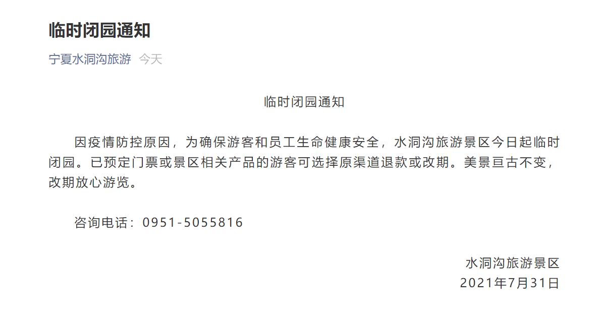 水洞溝旅游景區今日發布臨時閉園通知:因疫情防控原因,為確保游客和員工生命健康安全,水洞溝旅游景區今日起臨時閉園。已預定門票或景區相關產品的游客可選擇原渠道退款或改期。美景亙古不變,改期放心游覽。