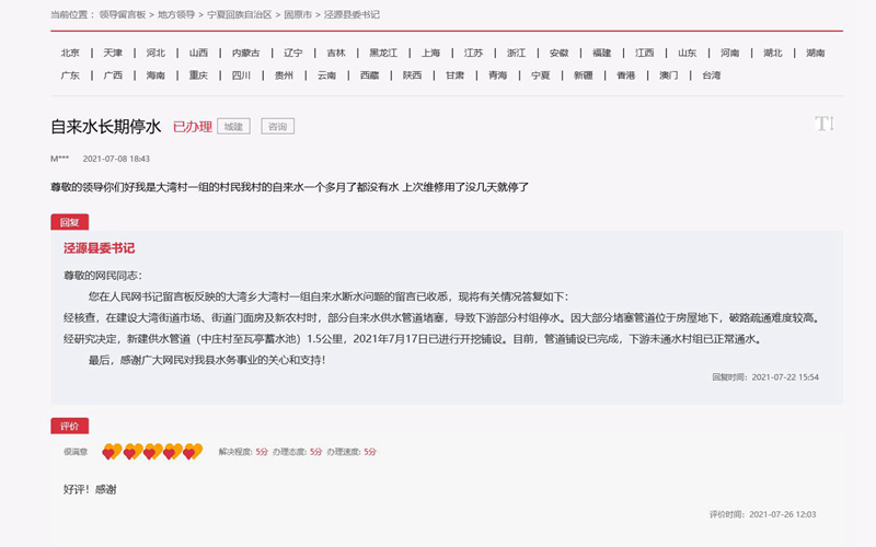 這不是馬明仁第一次在留言板上留言。2021年3月2日,馬明仁第一次向涇源縣委書記留言反映問題并尋求幫助。留言后的第三天,相關辦理單位就解決了問題!拔颐看瘟粞,辦理的工作人員都會及時給我打電話核實情況,并且態度非常好。以后有困難,還會到留言板反映!瘪R明仁說。