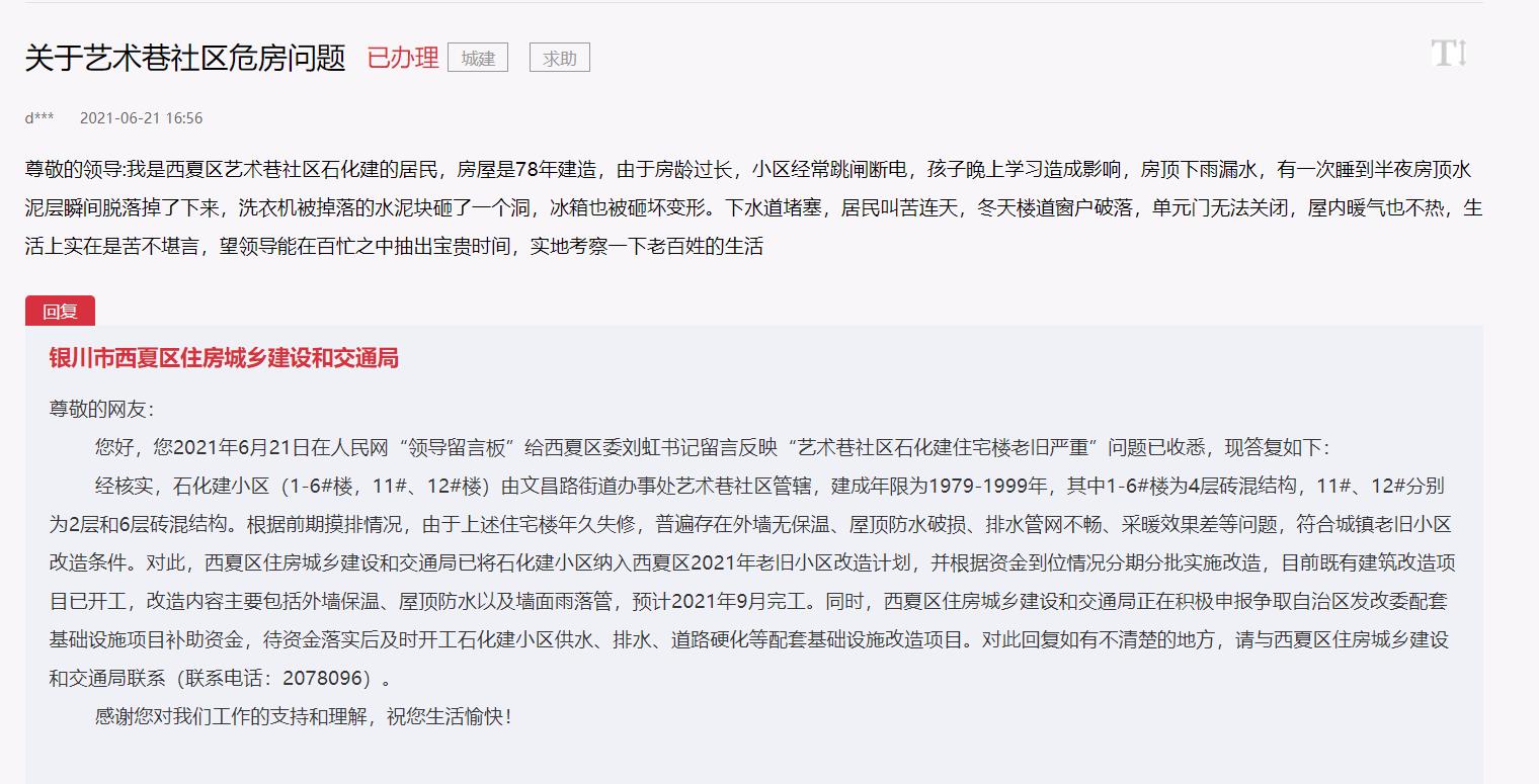 “小區住房是1978年建造的,實在太老了!經常跳閘斷電,影響孩子晚上學習,下水道堵塞,樓道窗戶破落,單元門無法關閉,屋內暖氣也不熱,讓人叫苦連天!币幻幼≡阢y川市西夏區藝術巷社區石化建小區的網民,在“領導留言板”上留言希望盡快解決所在小區住房老化問題。