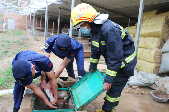 消防隊員從消防車向林場水窖里放水。海原縣委宣傳部供圖