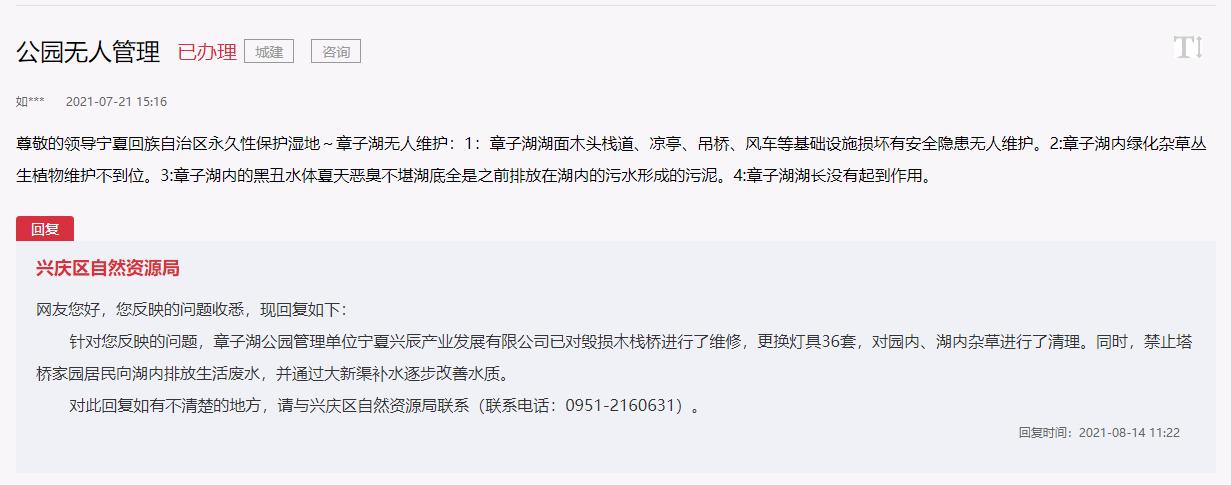 對此,銀川市興慶區自然資源局回復:章子湖公園管理單位寧夏興辰產業發展有限公司已對毀損木棧橋進行了維修,更換燈具36套,對園內、湖內雜草進行了清理。同時,禁止塔橋家園居民向湖內排放生活廢水,并通過大新渠補水逐步改善水質。