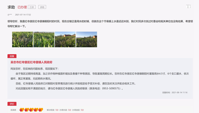 近日,寧夏一位網友在人民網“領導留言板”反映,寧夏紅寺堡區朝陽村的莊稼供水不及時的問題。該網友表示,“現在莊稼正是用水的時候,但就在這個節骨眼上水是遲遲未到,我們村民多次找過村委會和相關單位也沒有結果,希望領導幫忙解決一下!