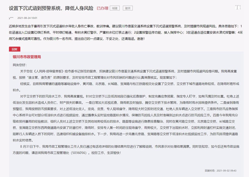 人民網銀川9月6日電(趙茉鈺)“近期多地發生由于暴雨引發下沉式涵道積水導致人身傷亡事故,教訓慘痛!苯,銀川一網友在人民網“領導留言板”上留言,建議銀川市借鑒交通系統設置下沉式涵道預警系統,及時提醒市民規避風險。