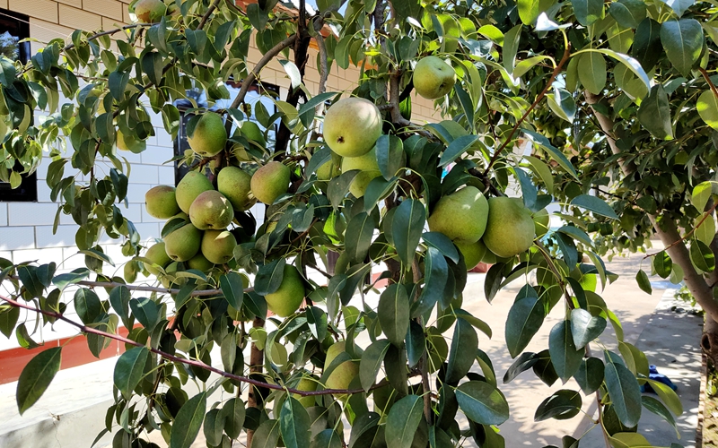 村道寬敞干凈,踏進寧夏西吉縣關莊村村支書蘇祥羽家小院,梨樹、杏樹、蘋果樹、海棠花擠滿院落。梨子脆甜,蘋果清香,如今正是成熟時,大可一飽口福。