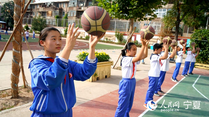 9月8日,銀川市興慶區第三小學學生正在進行籃球課后拓展訓練。 人民網 梁宏鑫攝