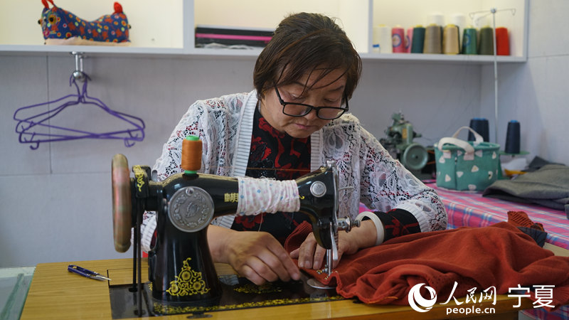 柳梅在為社區居民縫補衣服。人民網 梁宏鑫攝