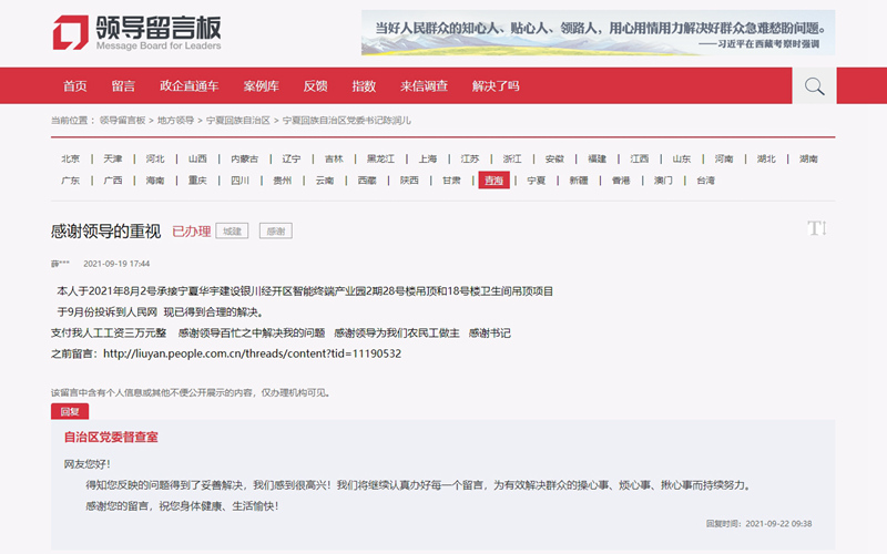 急難愁盼丨寧夏銀川:工資被拖欠留言求助獲解決 網友表示感謝