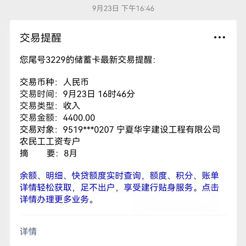 接到留言求助信息后,寧夏回族自治區人社廳勞動保障監察局核實了農民工信息與務工情況,確認59500元中有30000元屬于農民工工資。據薛強提供的到賬信息顯示,9月23日,寧夏華宇建設工程有限公司用農民工工資專戶向薛強等人支付了工資。