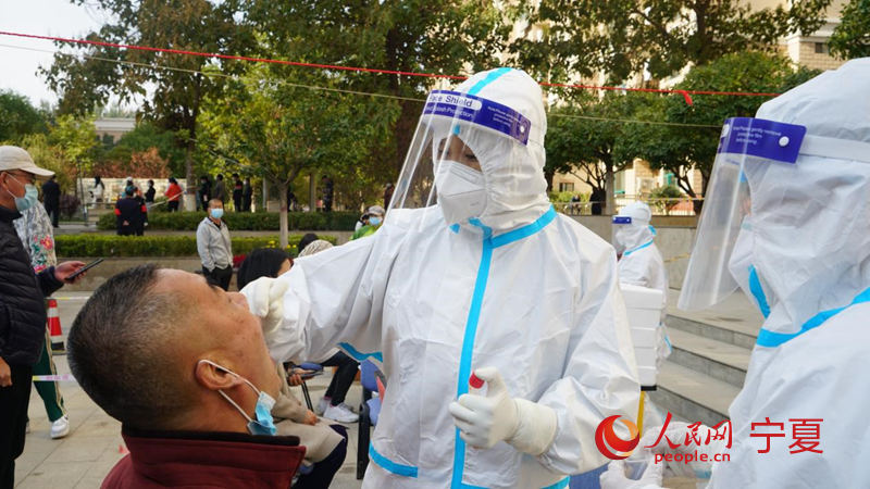人民網銀川10月23日電 (梁宏鑫)掃碼、錄入信息、取咽拭子……上午7時30分,銀川市第一人民醫院呼吸與危重醫學科主管護師劉艷紅剛下夜班回到家,看到“定點核酸檢測小組”的醫護人員在自家小區附近的興慶區銀華社區開展核酸檢測工作。她沒有來得及休息,又穿上防護服,加入檢測小組,為社區居民進行采樣。