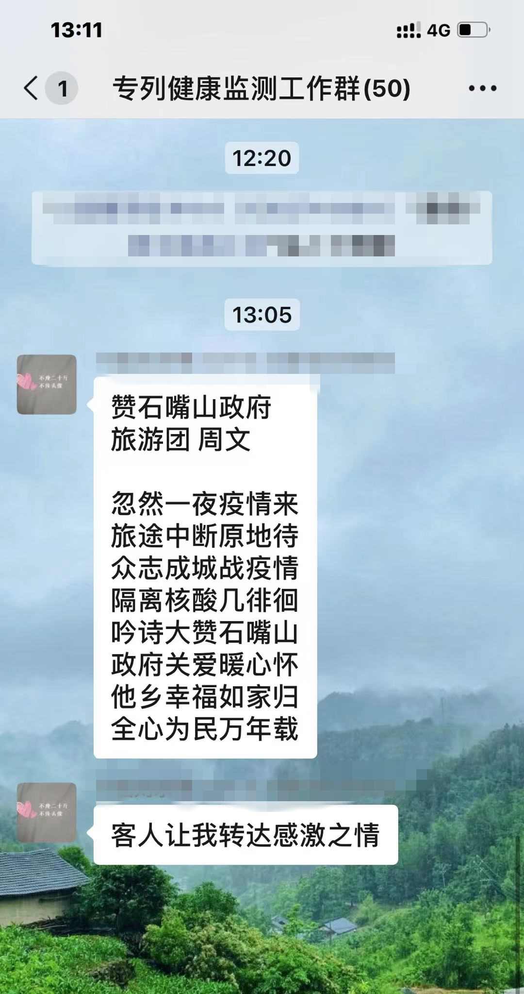 “政府關愛暖心懷,他鄉幸福如家歸!苯,滯留在石嘴山的游客周文寫了一首打油詩,表達對工作人員的感謝。