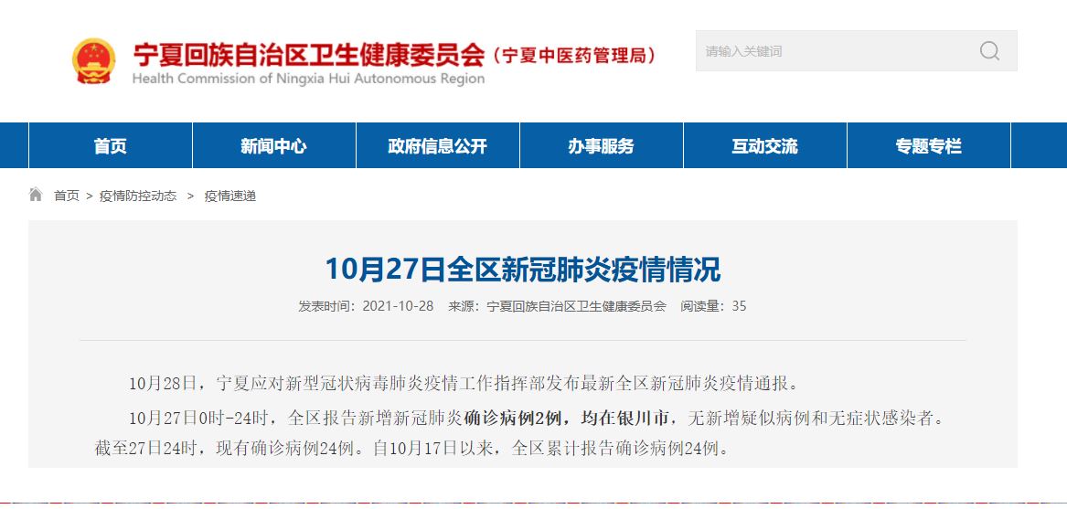 10月27日寧夏新增新冠肺炎確診病例2例 均在銀川市