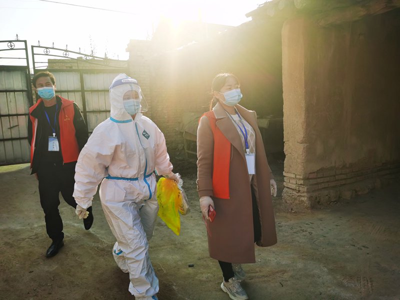 駐村第一書記協助工作人員入戶進行核酸檢測。銀川市金鳳區委宣傳部供圖