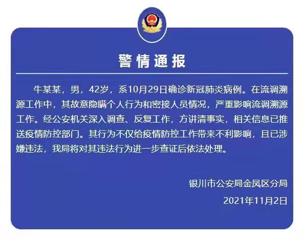 人民網銀川11月3日電 (閻夢婕)11月2日,銀川市金鳳區公安分局發布警情通報,一確診病例故意隱瞞個人行為和密接人員情況,已涉嫌違法,警方將對其違法行為進一步查證后依法處理。
