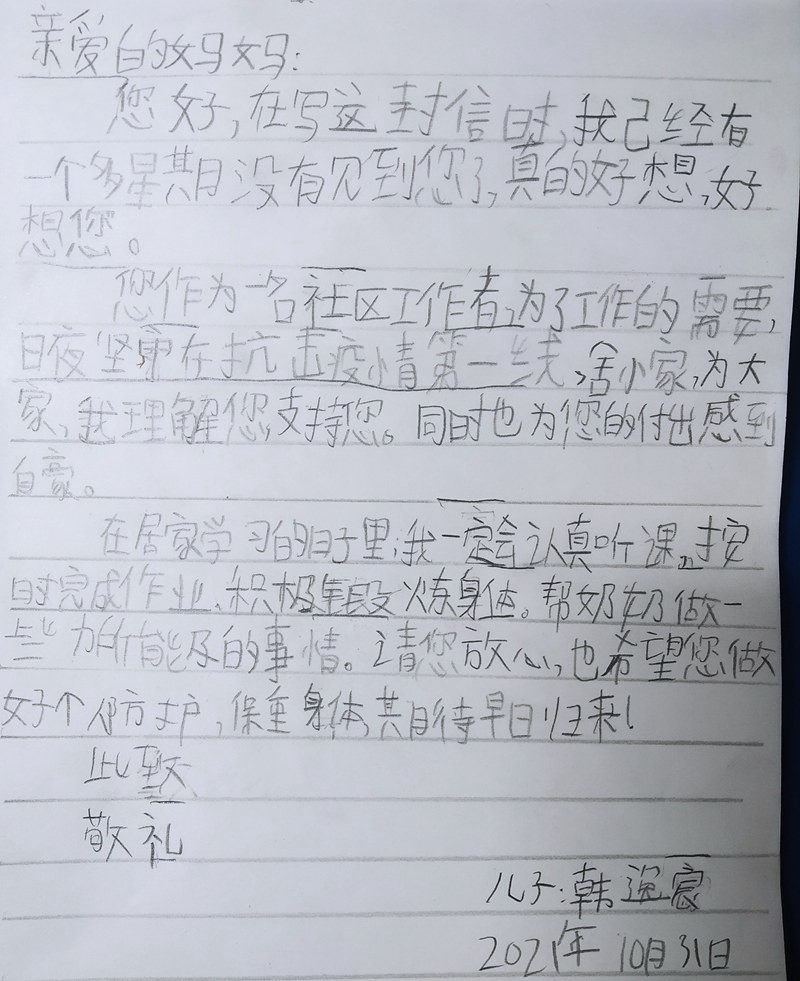 “您作為一名社區工作者,為了工作的需要,日夜堅守在抗擊疫情第一線,舍小家,為大家。我理解您,支持您!同時也為您的付出感到自豪!”稚嫩的筆跡、簡短的語言、字里行間既有韓昱辰對媽媽的思念,也有對媽媽工作的贊揚,更有對媽媽的擔憂和叮囑。