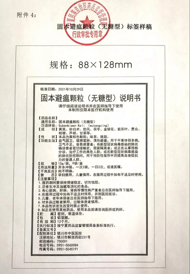 人民網銀川11月4日電 (梁宏鑫)據銀川市中醫醫院官微公布,11月3日,銀川市中醫醫院制劑中心研制的新冠肺炎預防方——“固本避瘟顆粒(無糖型)”,在寧夏藥品監督管理局的大力支持和有力指導下,順利獲得緊急備案,是2021年寧夏首個審批通過的預防新冠肺炎的中藥院內制劑。