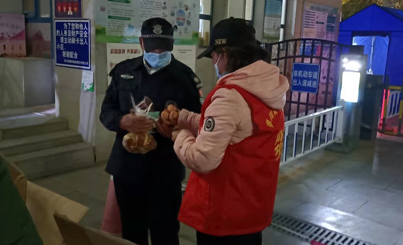 劉欣麗(右)為一線物業人員送“夜宵”。受訪者供圖
