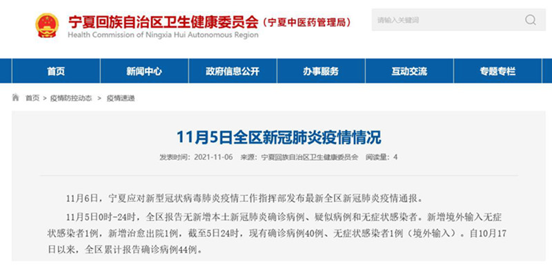 11月5日寧夏新增境外輸入無癥狀感染者1例,無新增確診病例