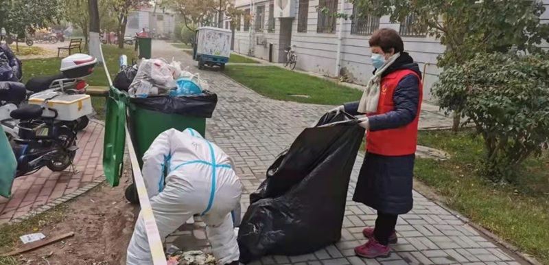 “蘭花芬芳志愿突擊隊”隊員周文盈與工作人員一起處理封控居民生活垃圾。寧夏婦聯供圖
